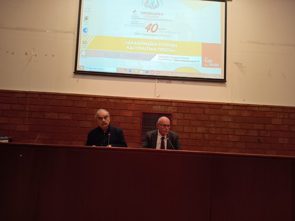Σαράντα χρόνια συμπληρώθηκαν από τον θάνατο του Σάκη Καράγιωργα (1935–1985), ενός από τους σημαντικότερους Έλληνες κοινωνιολόγους, πολιτικούς οικονομολόγους και πανεπιστημιακούς δασκάλους του 20ού αιώνα. Με αφορμή αυτή την επέτειο, το Ίδρυμα Σάκης Καράγιωργας διοργάνωσε στις 23 Ιανουαρίου 2026 επιστημονική ημερίδα με τίτλο «Ακαδημαϊκή Ευθύνη και Πολιτική Πράξη», στο Αμφιθέατρο «Σάκης Καράγιωργας ΙΙ» του Παντείου Πανεπιστημίου Αθηνών.